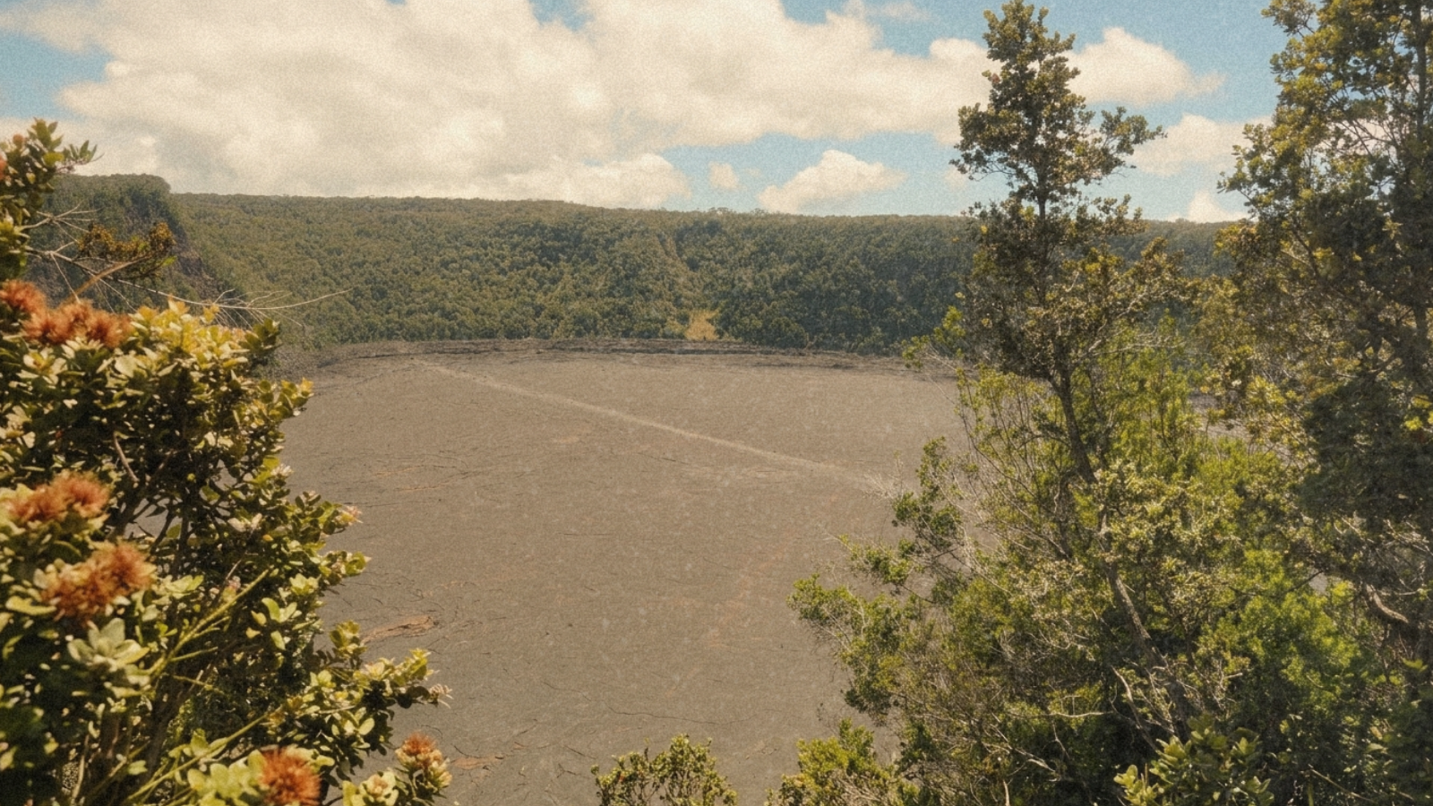 If you only do one hike here, make it the Kīlauea Iki Trail. It’s about 3 miles, but it feels like something much bigger. You start in thick greenery, descend into a massive crater, and then just… walk across it. A full lava lake, now cooled and cracked beneath your feet, with steam still rising in places like it’s not entirely finished.