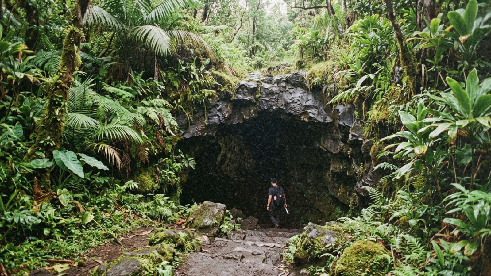 Just outside Hilo, Kaumana Caves drops you straight into a lava tube with almost no buildup. One minute you’re on the road, the next you’re heading down a steep metal staircase into something dark, cool, and a little surreal.