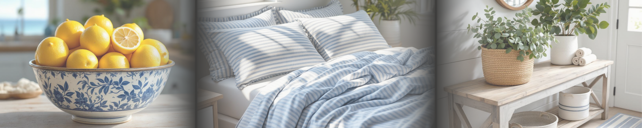 Bring forward woven textures, soft blues, whites, and natural materials